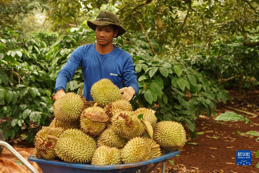 9月15日,在越南多樂省一家榴蓮果園,一名果農將剛采摘的榴蓮放進推車。