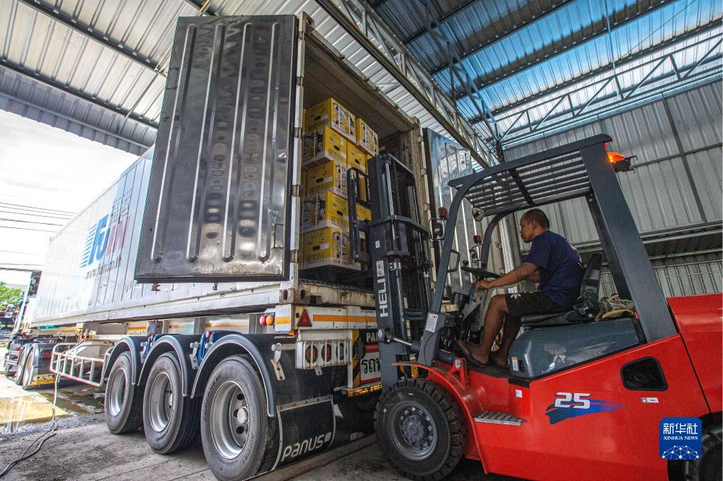 9月19日,在泰國春蓬府一家榴蓮工廠內,工作人員將包裝好的榴蓮裝車。