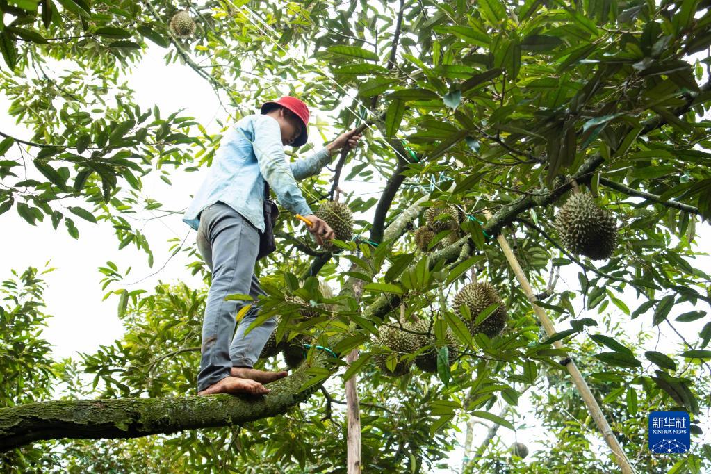 9月15日,在越南多樂省一家榴蓮果園,一名果農爬到樹上采摘榴蓮。