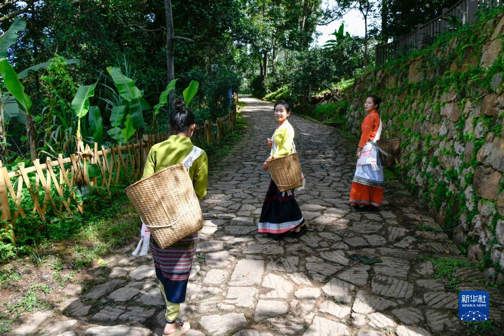 9月19日,布朗族茶農小花(右)、玉炳(中)和玉勐準備進入古茶林采茶。