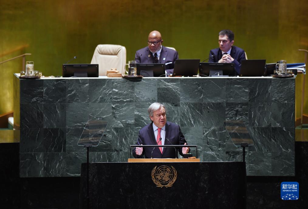 9月19日,在位于紐約的聯(lián)合國(guó)總部,聯(lián)合國(guó)秘書長(zhǎng)古特雷斯(前)在第78屆聯(lián)合國(guó)大會(huì)一般性辯論開幕式上講話。