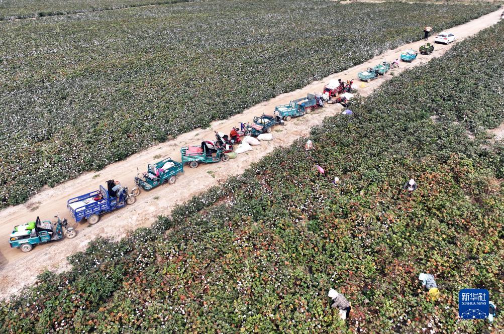 9月19日,山東省無棣縣西小王鎮棉農在采收新棉(無人機照片)。