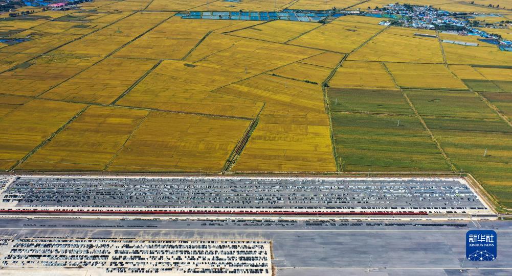 中歐班列(沈陽)集結中心停滿待發運車輛的停車場與周邊的農田景色(無人機照片,9月19日攝)。