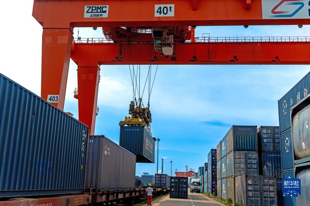 在大連市金港站,中國鐵路沈陽局集團有限公司工作人員使用龍門吊進行中歐班列裝車作業(6月27日攝)。