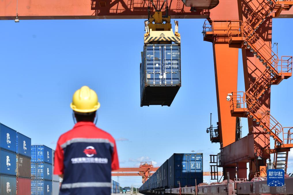 9月19日,在中歐班列(沈陽)集結中心,中國鐵路沈陽局集團有限公司工作人員使用龍門吊進行中歐班列裝車作業。