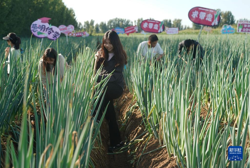 9月20日,在北京市平谷區東高村鎮趙家務村大蔥種植基地,市民在活動現場體驗拔大蔥。