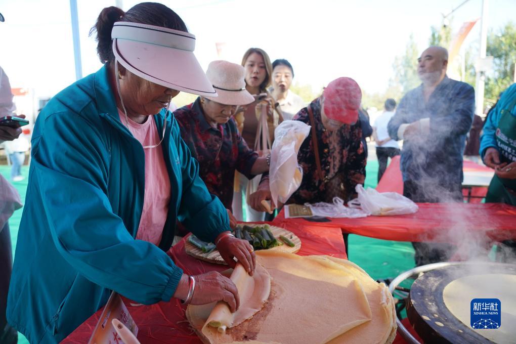 9月20日,在北京市平谷區東高村鎮趙家務村大蔥種植基地,市民在活動現場品嘗煎餅卷大蔥。