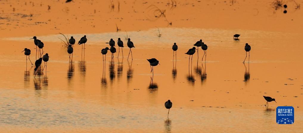 群鳥棲息在夕陽下的東臺條子泥濕地(8月31日攝)。