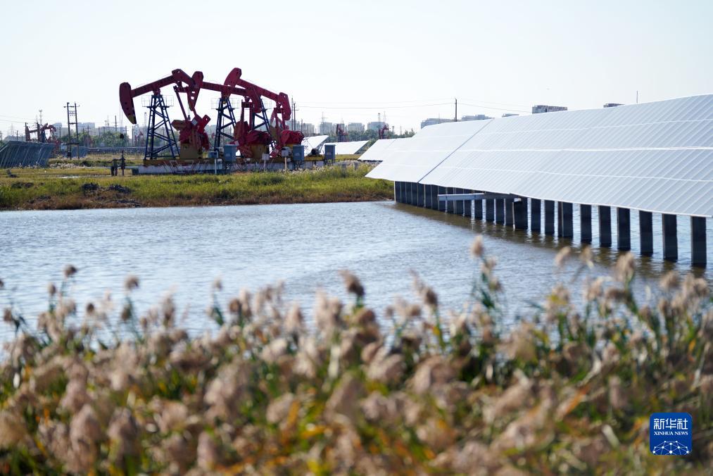 9月19日,在大慶油田星火水面光伏電站,電站設(shè)施與附近的抽油機(jī)相映成趣。