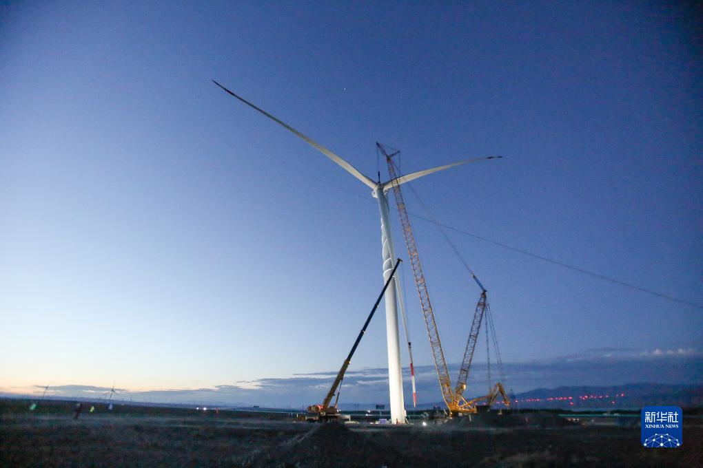 在新疆達(dá)坂城風(fēng)電場拍攝的一臺風(fēng)力發(fā)電機(jī)組吊裝作業(yè)現(xiàn)場(8月4日攝)。
