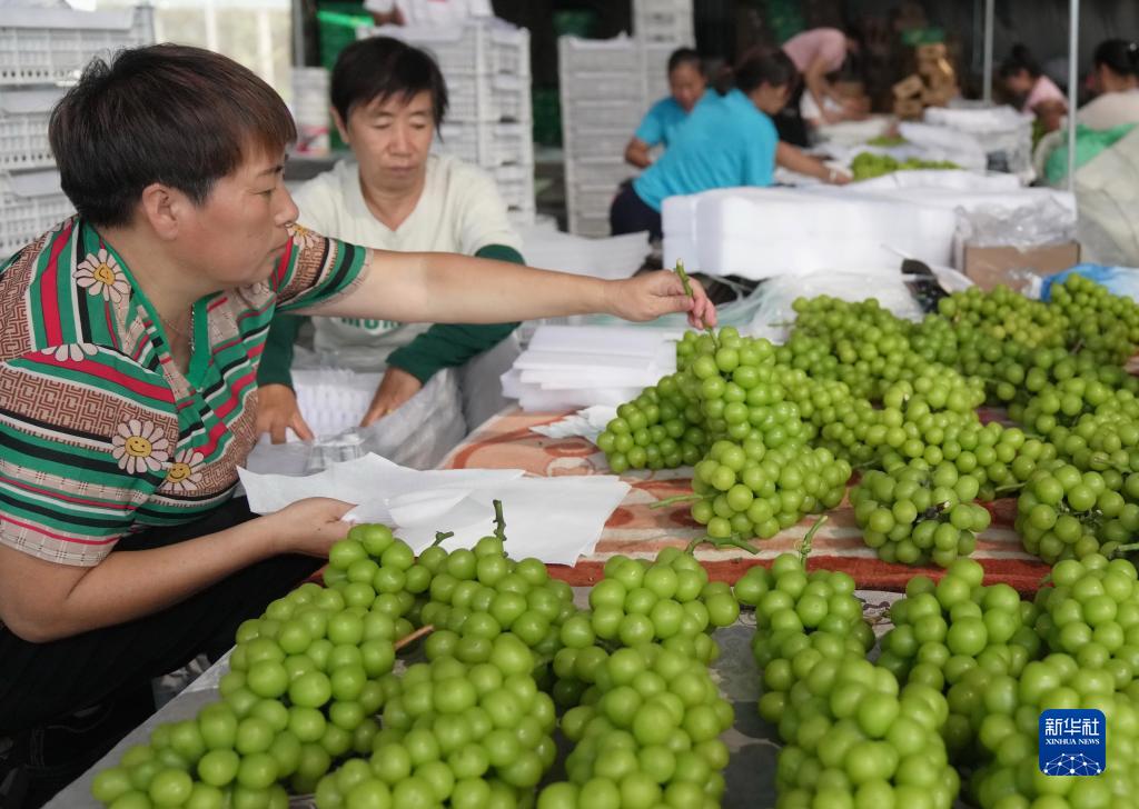 9月20日,河北省晉州市馬于鎮北辛莊村一家葡萄種植合作社的社員在將采摘的葡萄分揀、裝箱。