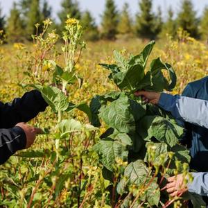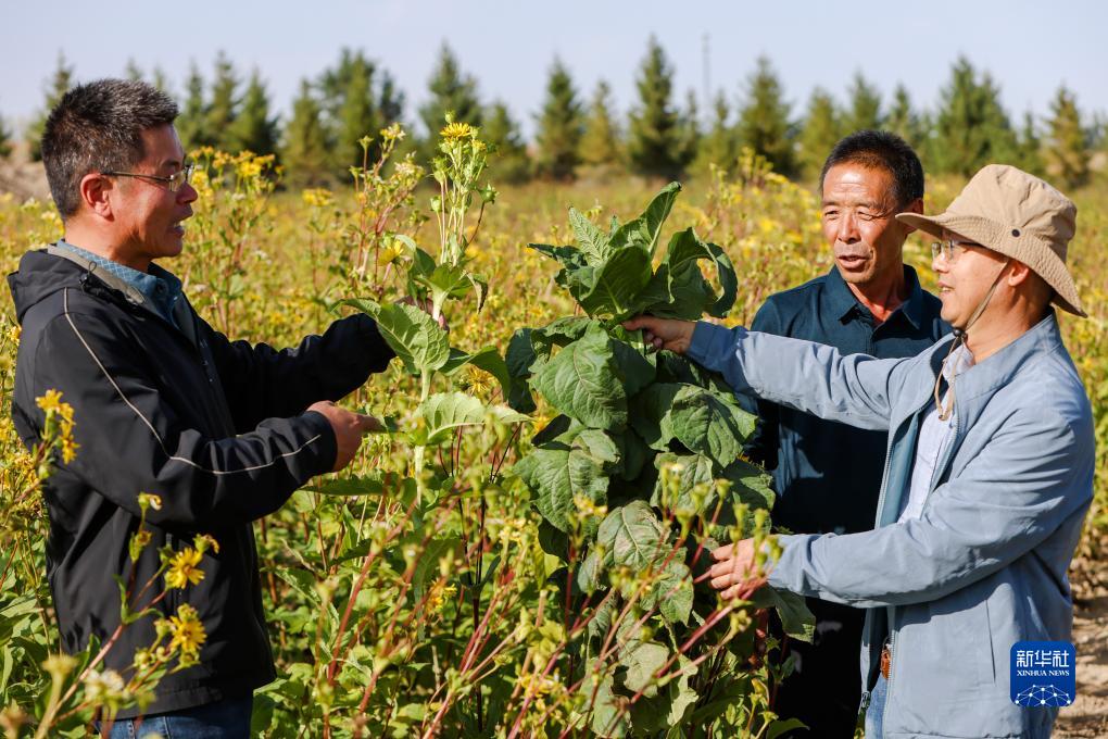 來自福建省南平市光澤縣農業農村局的援疆干部呂軍(左)、來自福建省武夷山市經濟作物技術站的援疆干部黃文慶(右)與新疆木壘生福生態農業發展有限公司負責人閆生福交流試種的大葉蛋白菊生長情況(9月20日攝)。