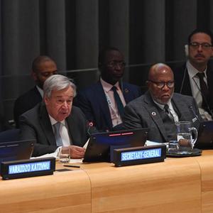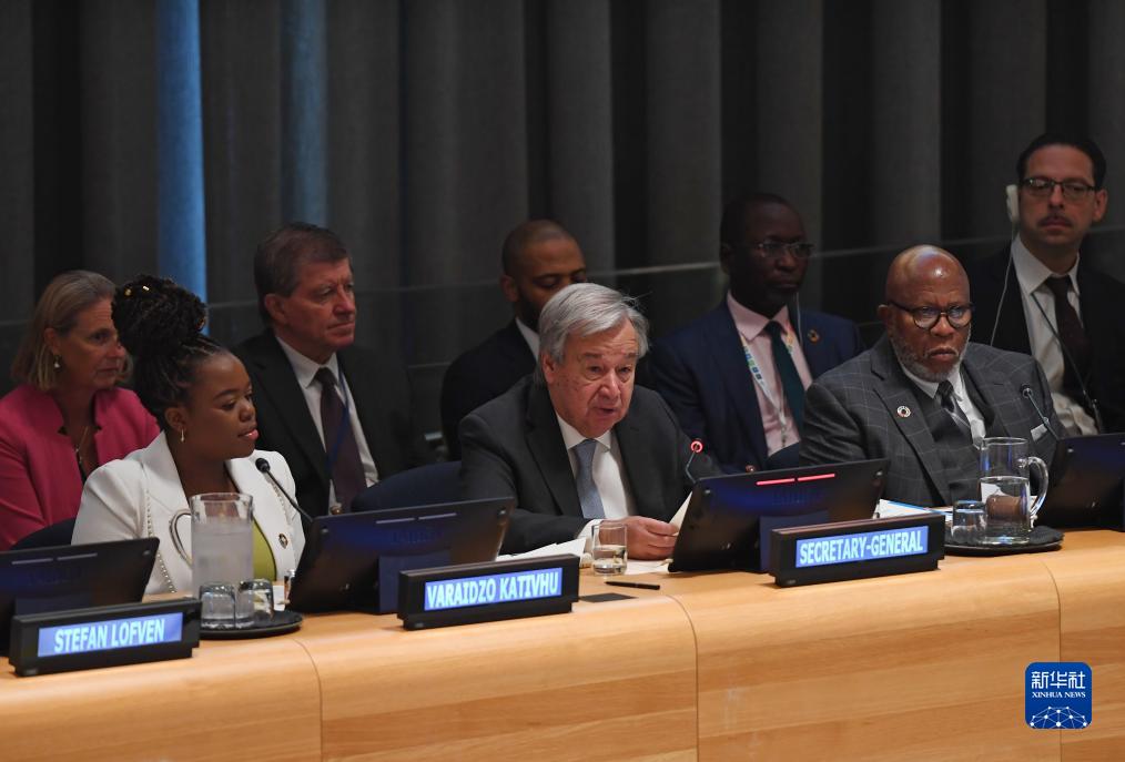9月21日,在位于紐約的聯合國總部,聯合國秘書長古特雷斯(前中)在未來峰會部長級籌備會上講話。