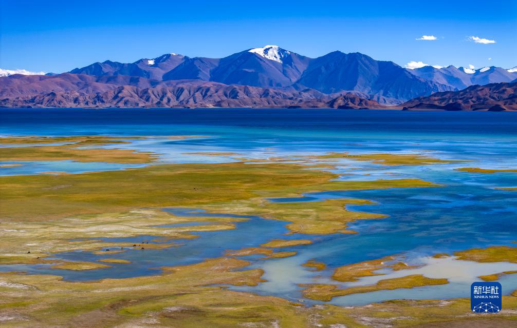鳥瞰班公湖畔的濕地(無人機照片,9月21日攝)。