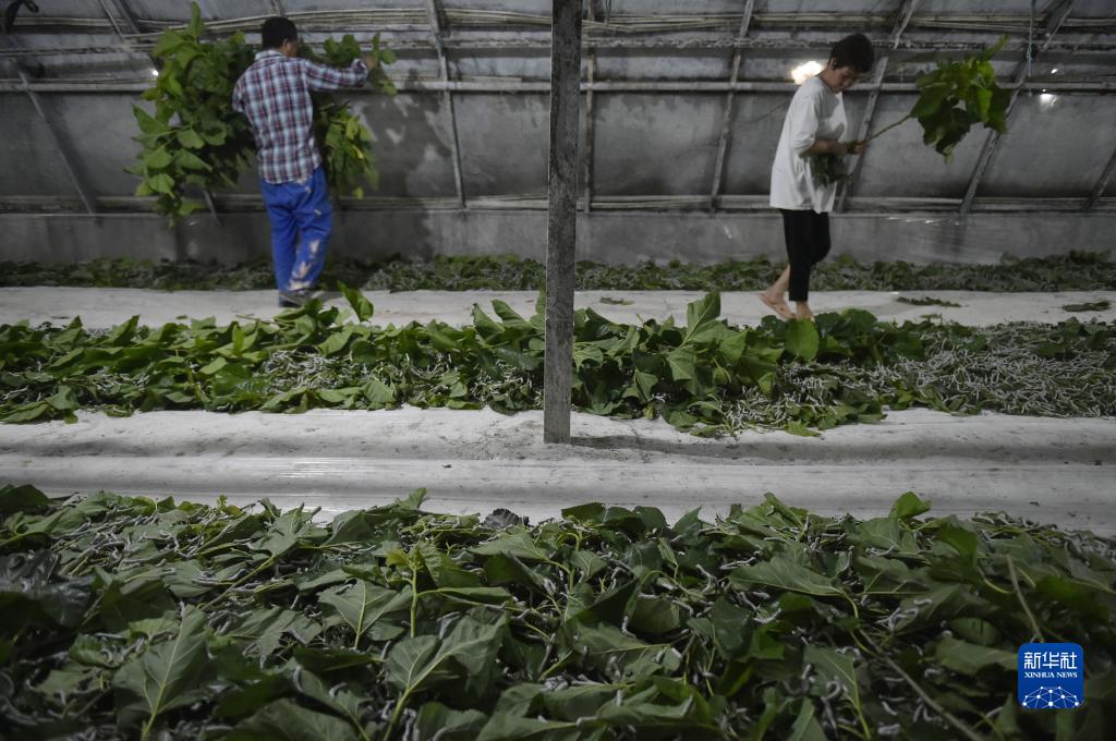 9月21日,在汝州市焦村鎮一處養蠶大棚內,村民在用桑葉喂食桑蠶。