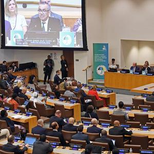 這是9月21日在位于紐約的聯(lián)合國(guó)總部拍攝的第二次聯(lián)合國(guó)全民健康覆蓋問(wèn)題高級(jí)別會(huì)議現(xiàn)場(chǎng)。