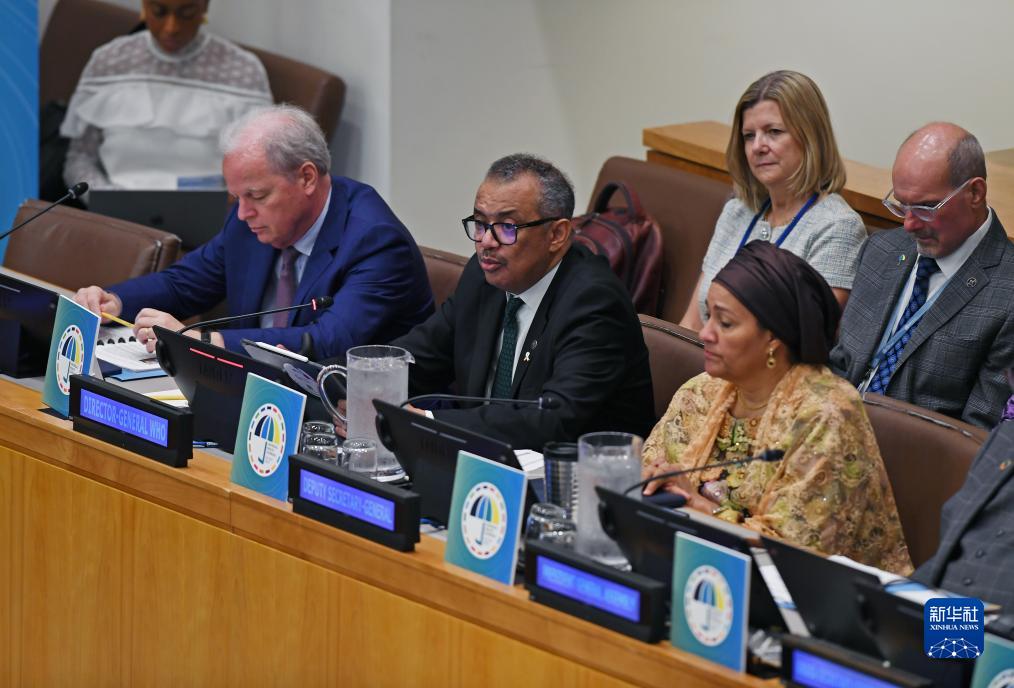 9月21日,在位于紐約的聯(lián)合國總部,世界衛(wèi)生組織總干事譚德塞(前排中)在第二次聯(lián)合國全民健康覆蓋問題高級別會議上講話。