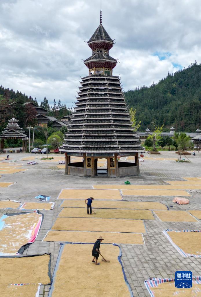 9月19日,貴州省黔東南苗族侗族自治州從江縣高增鄉(xiāng)小黃村村民在晾曬稻谷(無(wú)人機(jī)照片)。