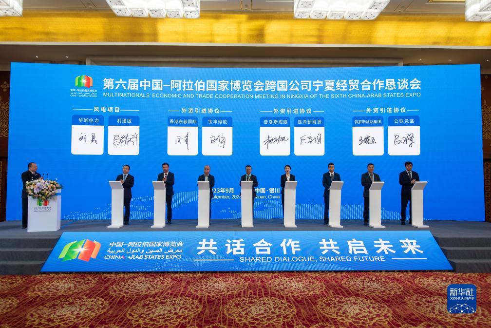 這是9月21日在銀川拍攝的第六屆中阿博覽會跨國公司寧夏經貿合作懇談會簽約儀式現場。