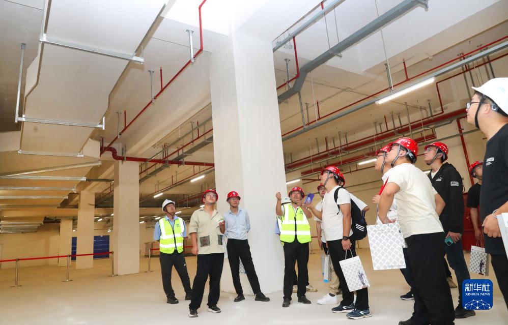 9月22日,中建二局安裝公司技術人員(中)在施工現場向觀摩團成員介紹地下室頂棚線路排布工程。