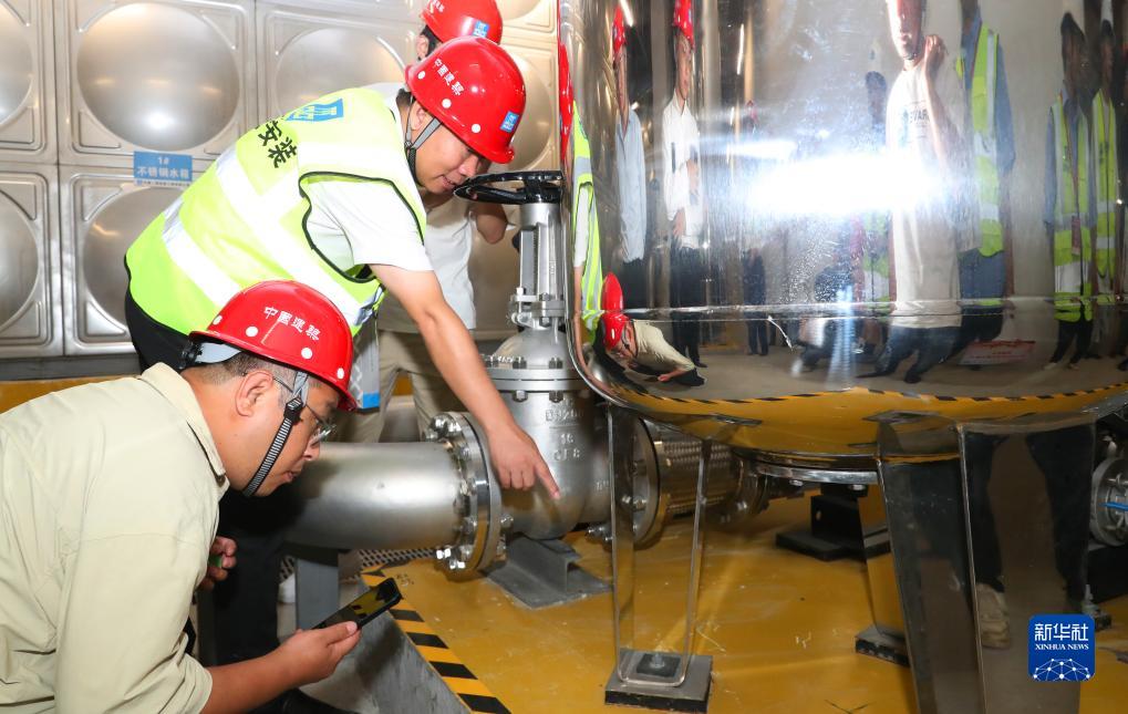9月22日,中建二局安裝公司技術(shù)人員(左二)在施工現(xiàn)場向觀摩團(tuán)成員介紹水泵房設(shè)備的安裝特點(diǎn)。