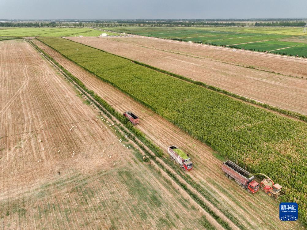 在內蒙古巴彥淖爾市臨河區城關鎮,收割機在收割青儲玉米(無人機照片,9月14日攝)。