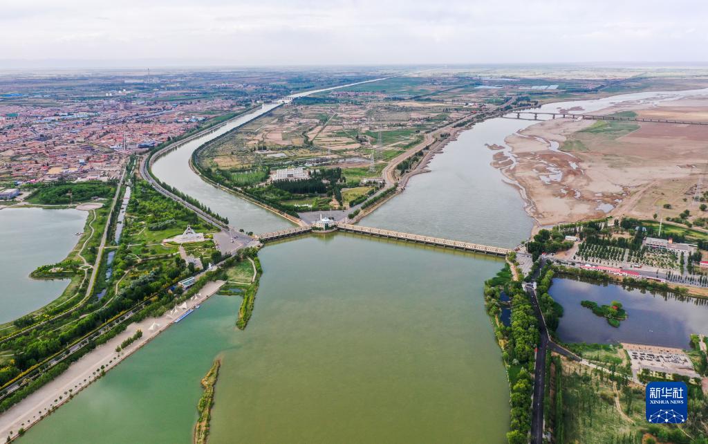 這是被譽為“萬里黃河第一閘”的三盛公水利樞紐,內蒙古每年利用三盛公水利樞紐定量分流黃河凌汛水、灌溉間隙水,統籌實施烏梁素海生態補水(無人機照片,6月6日攝)。
