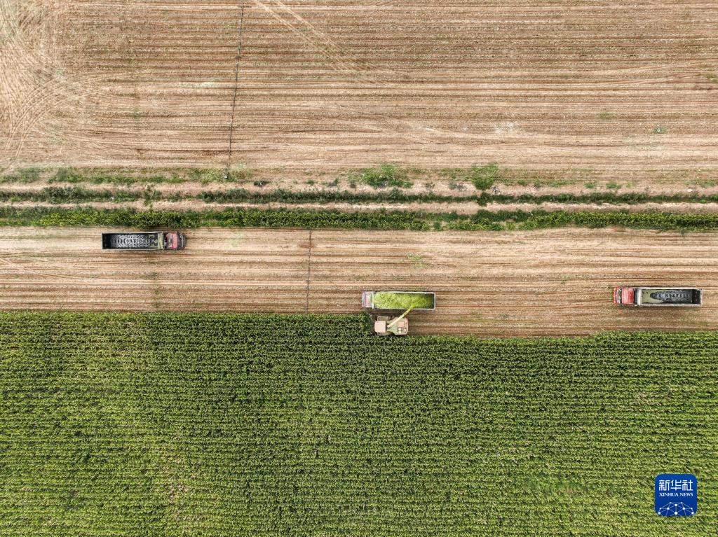 在內蒙古巴彥淖爾市臨河區城關鎮,收割機在收割青儲玉米(無人機照片,9月14日攝)。
