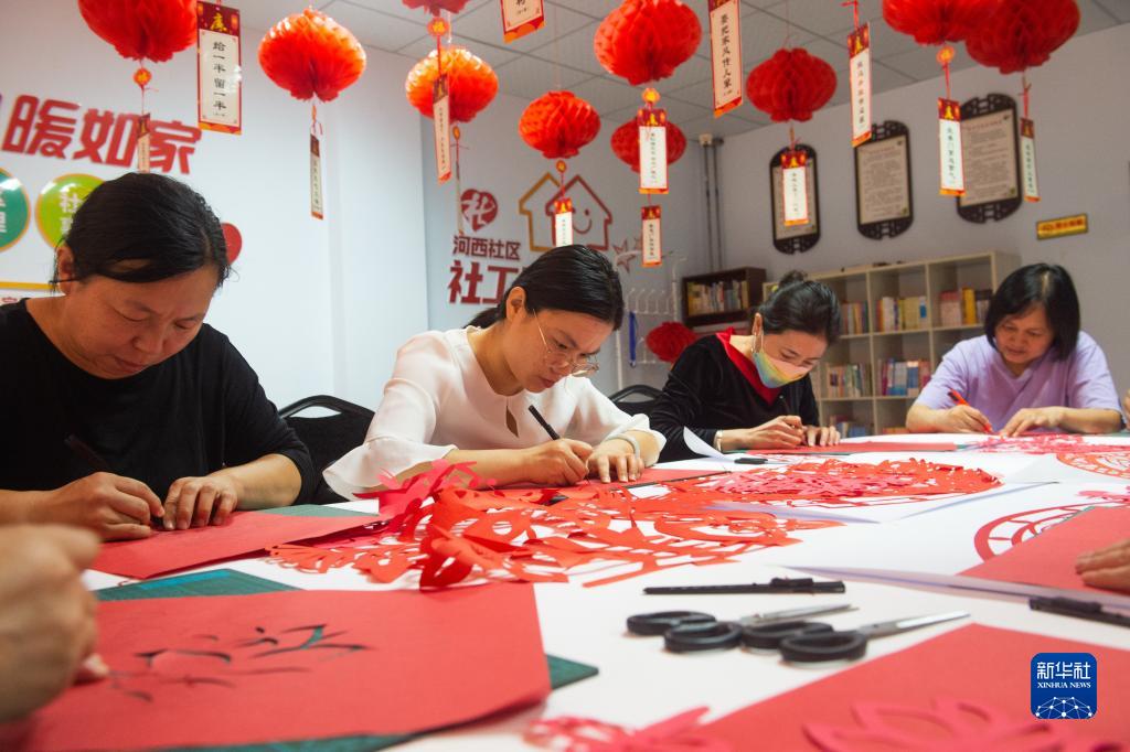 9月26日,在河北省棗強縣河西社區,黨員干部和居民共同制作廉政剪紙作品。