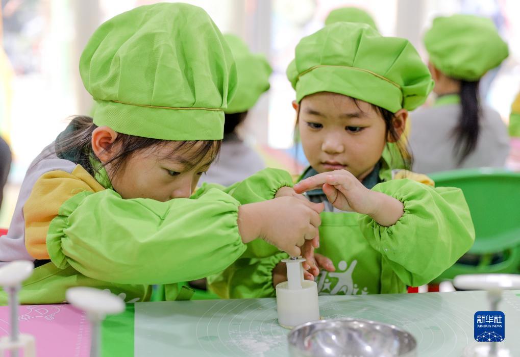 9月26日,在河北省衡水市桃城區一家幼兒園,孩子們共同制作月餅。