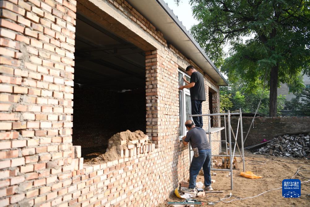 9月26日,工人在河北保定涿州市刁窩鎮(zhèn)刁四村一處受損房屋重建現(xiàn)場(chǎng)安裝窗戶。