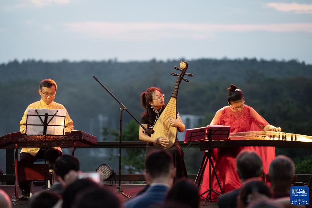 9月29日,演員在巴西伊瓜蘇舉行的中秋晚會上演奏中國民樂。