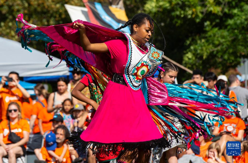 9月30日,身著原住民服飾的兒童在加拿大多倫多舉辦的“全國真相與和解日”紀念活動中表演舞蹈。