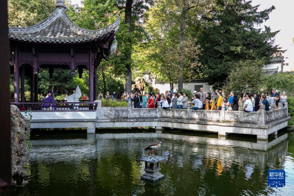 中秋、國慶“雙節”到來之際,德國法蘭克福的中式園林“春華園”于9月30日舉辦漢服游園會,漢服展示、舞蹈表演、中國傳統文化體驗等多種活動吸引了眾多游客參加。