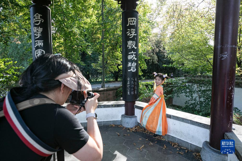 中秋、國慶“雙節(jié)”到來之際,德國法蘭克福的中式園林“春華園”于9月30日舉辦漢服游園會,漢服展示、舞蹈表演、中國傳統(tǒng)文化體驗等多種活動吸引了眾多游客參加。