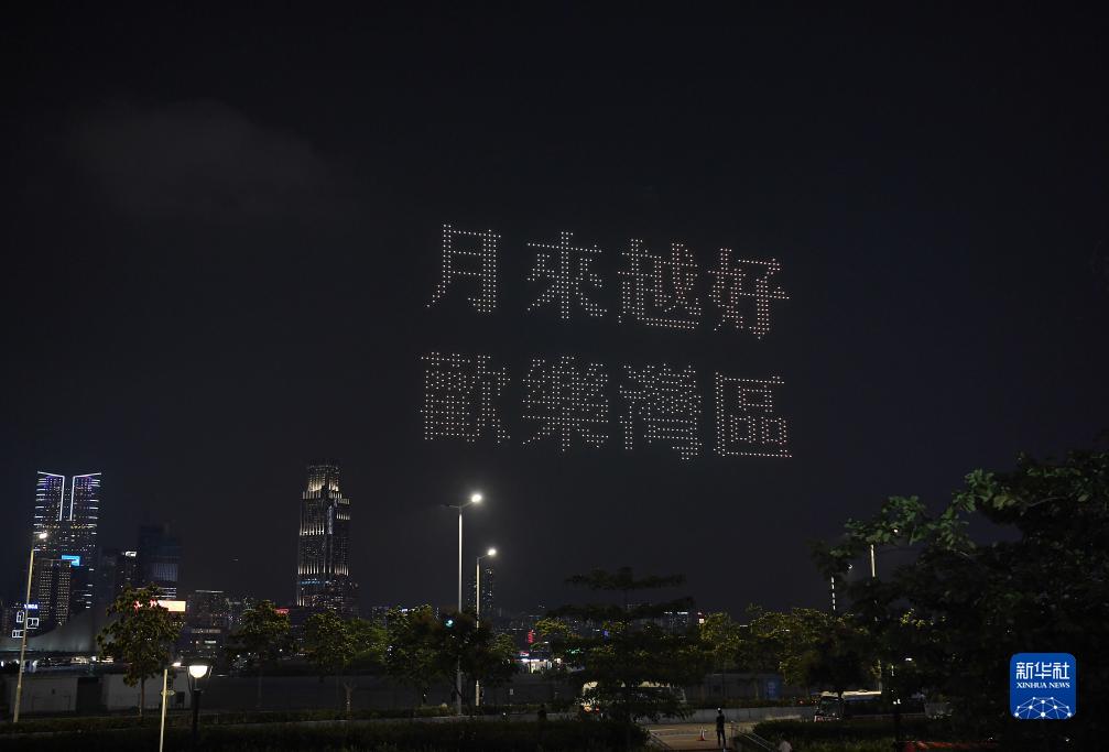 9月30日,無人機在維港上空拼成“月來越好 歡樂灣區”字樣。