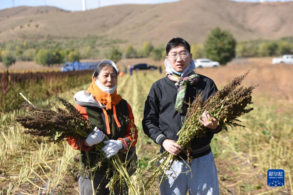 10月1日,在沽源縣白土窯鄉(xiāng)小西溝村,當?shù)胤N植戶王秀梅和她的兒子趙擎宇抱著收獲的紅藜麥合影。