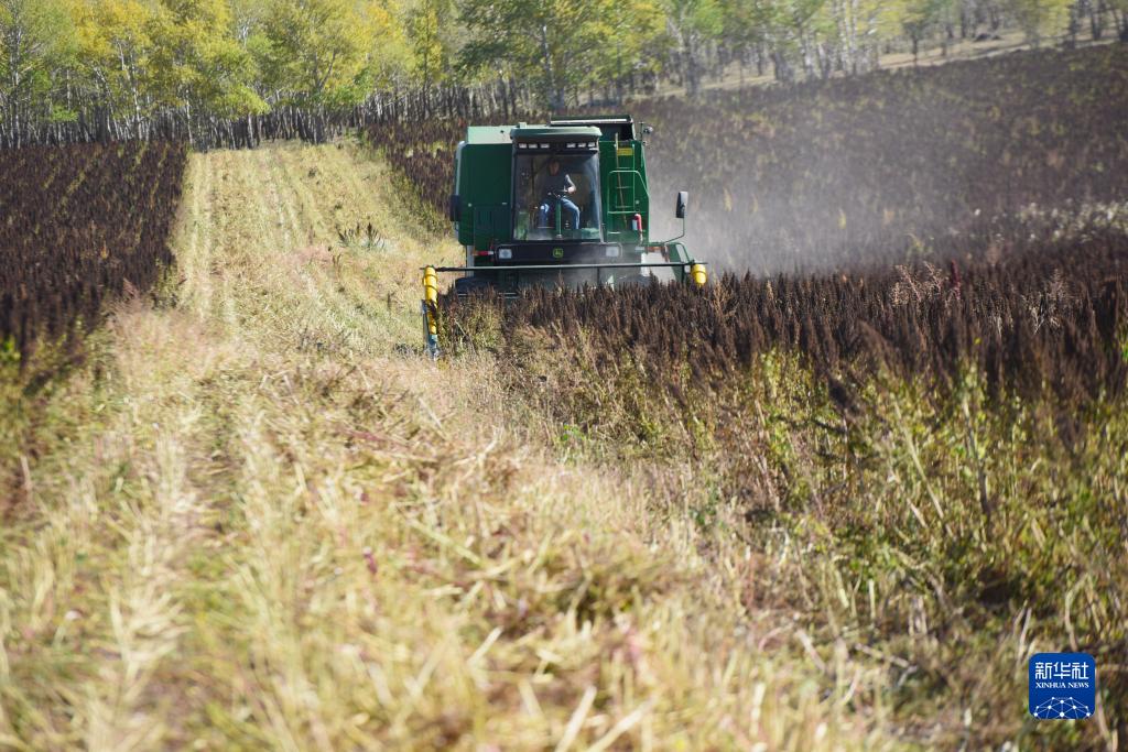 10月1日,在沽源縣白土窯鄉小西溝村,當地農機手王永成在操作收割機收獲藜麥。