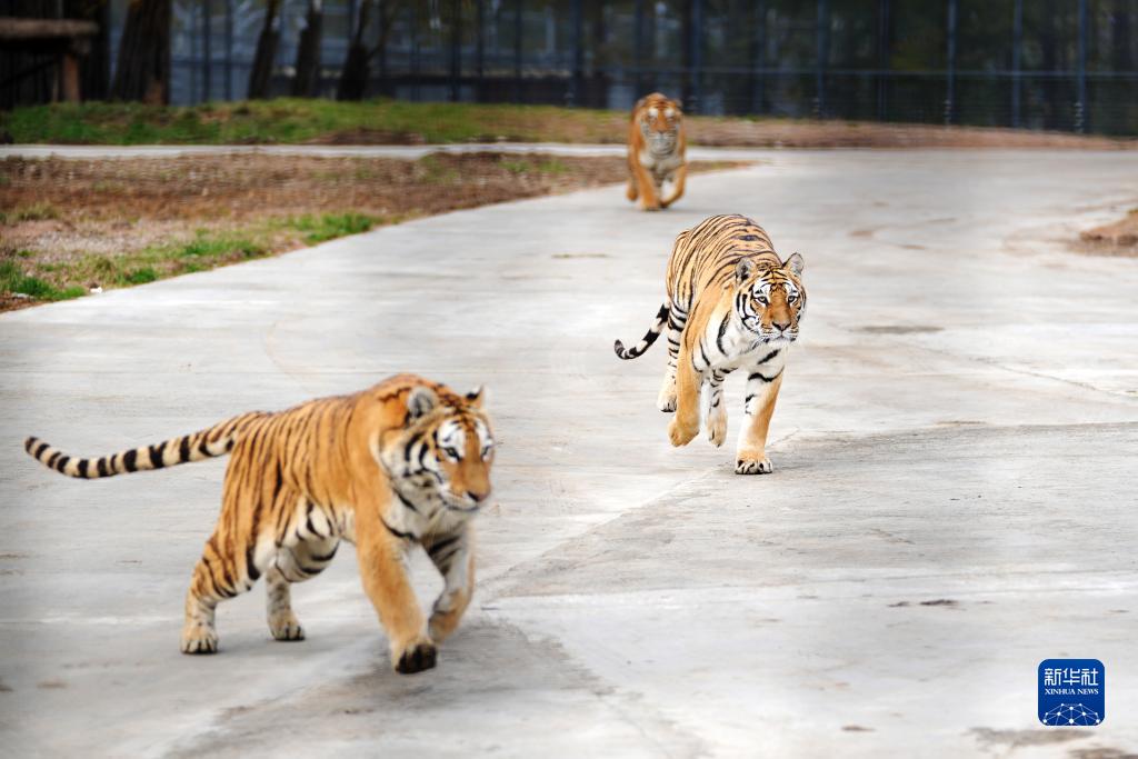 10月1日,東北虎在橫道河子東北虎林園東北虎散放區奔跑。