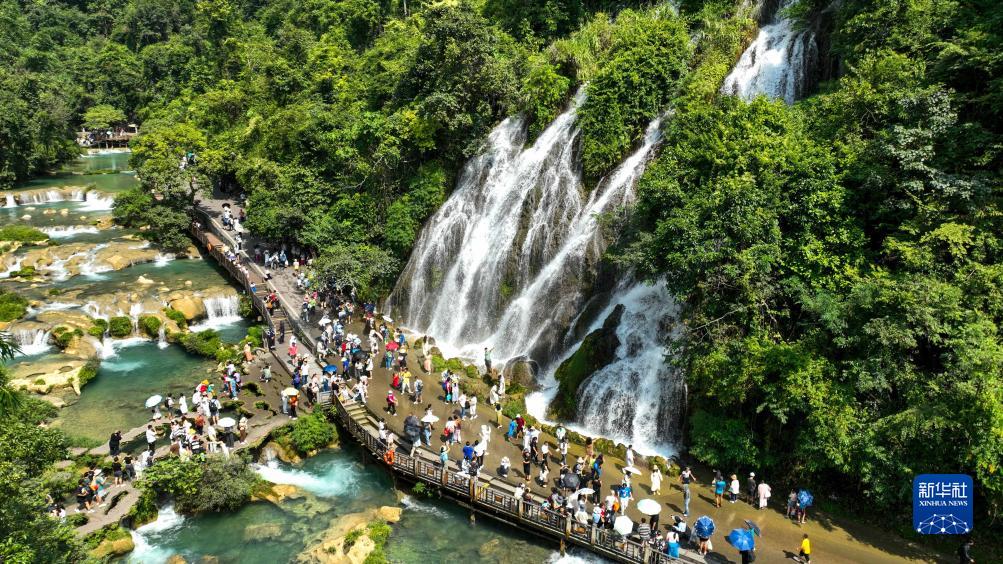 10月1日,游客在貴州省黔南布依族苗族自治州荔波縣小七孔景區(qū)觀光游玩(無人機(jī)照片)。