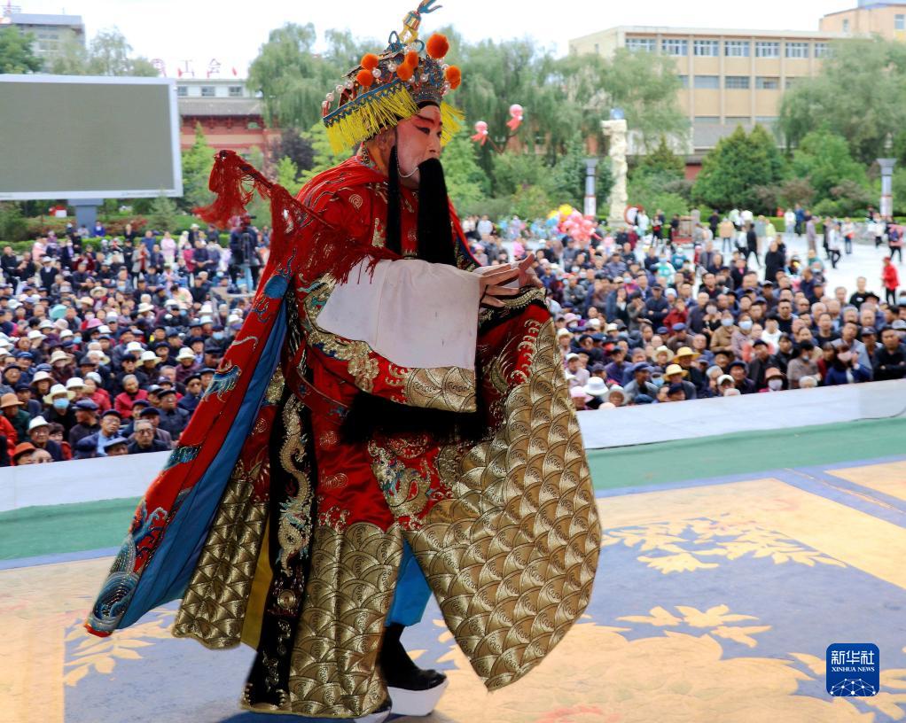 10月1日,在甘肅省平涼市靜寧縣成紀文化城,人們觀看秦腔表演。