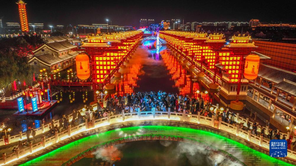 10月1日,游客在唐山市豐南區河頭老街賞燈游玩(無人機照片)。