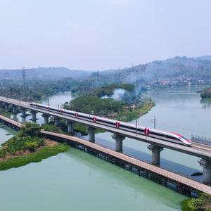 這是9月30日在印度尼西亞普哇加達(dá)拍攝的一列行駛中的雅萬(wàn)高鐵高速動(dòng)車(chē)組(無(wú)人機(jī)照片)。