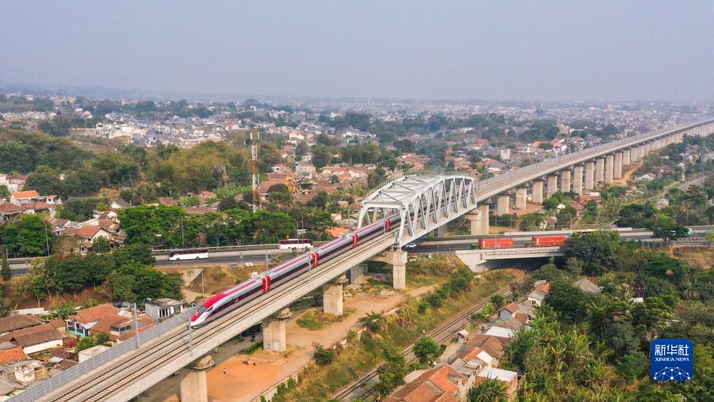 這是9月30日在印度尼西亞帕達拉朗拍攝的一列行駛中的雅萬高鐵高速動車組(無人機照片)。