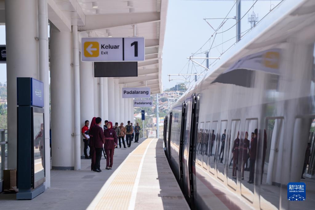 10月2日,一列雅萬高鐵動車組??吭谟《饶嵛鱽喤吝_拉朗車站。