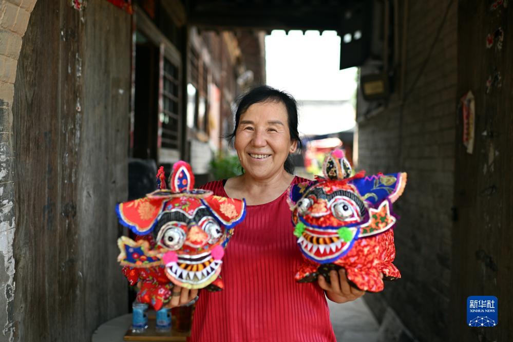 在山西磧口古鎮,村民馮延愛展示自己制作的布老虎(8月2日攝)。近年來,到磧口古鎮觀光的游客越來越多,馮延愛制作的布老虎和布鞋得到游客的青睞。靠銷售布老虎和布鞋,馮延愛一年收入3萬多元。