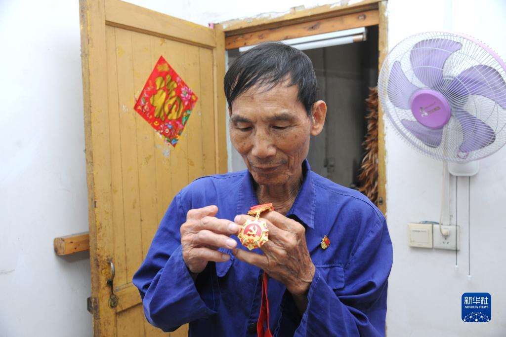 10月2日,梁樂在家中查看“在黨50年徽章”。