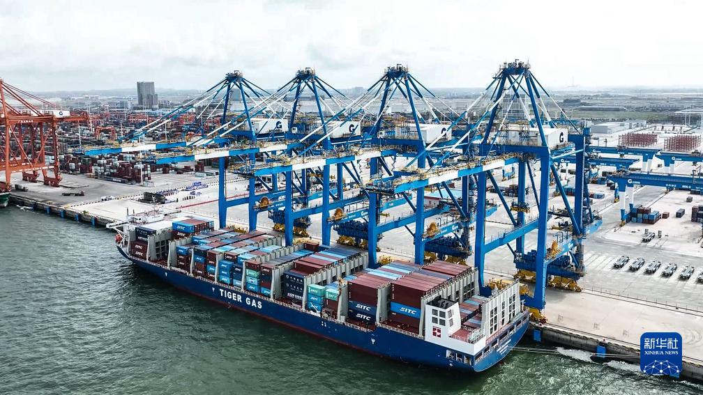 10月2日,一艘海輪停靠欽州港自動化碼頭卸貨(無人機照片)。