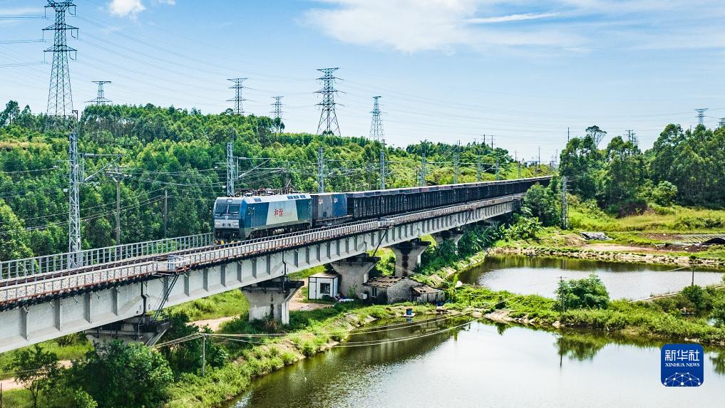 10月2日,滿載貨物的列車從欽州港東站駛出(無人機照片)。