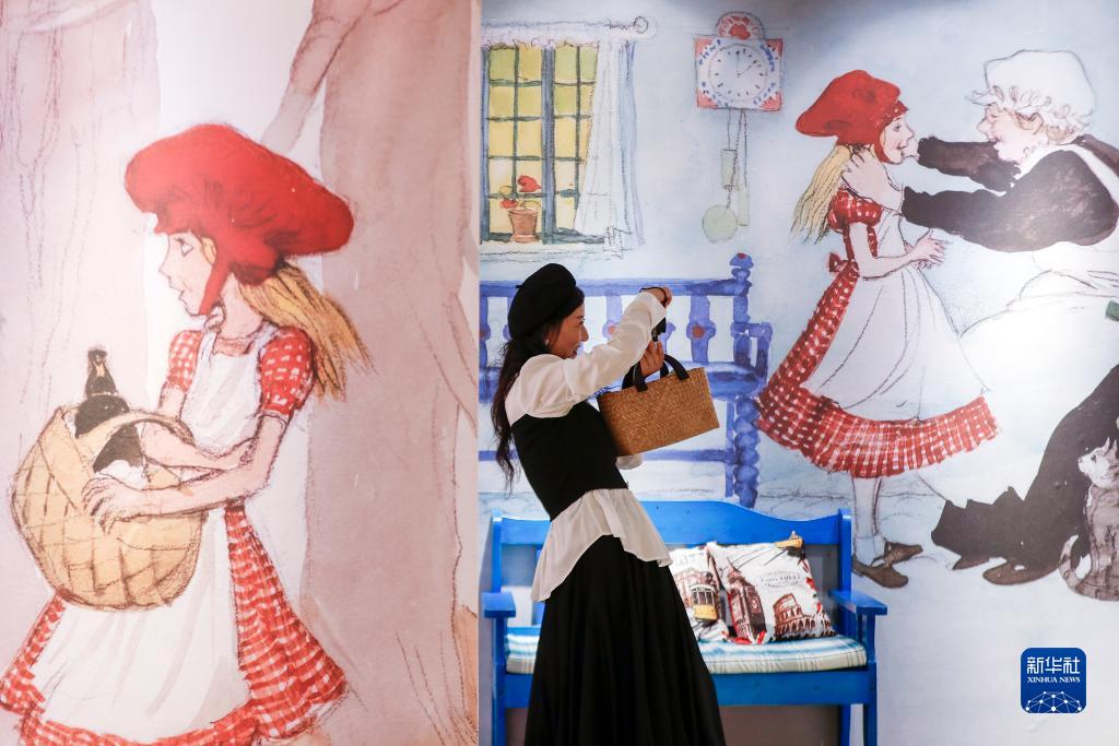 10月2日,一名女孩在安徽省黃山市屯溪區黎陽老街舉行的《世界插畫大展》上拍照。